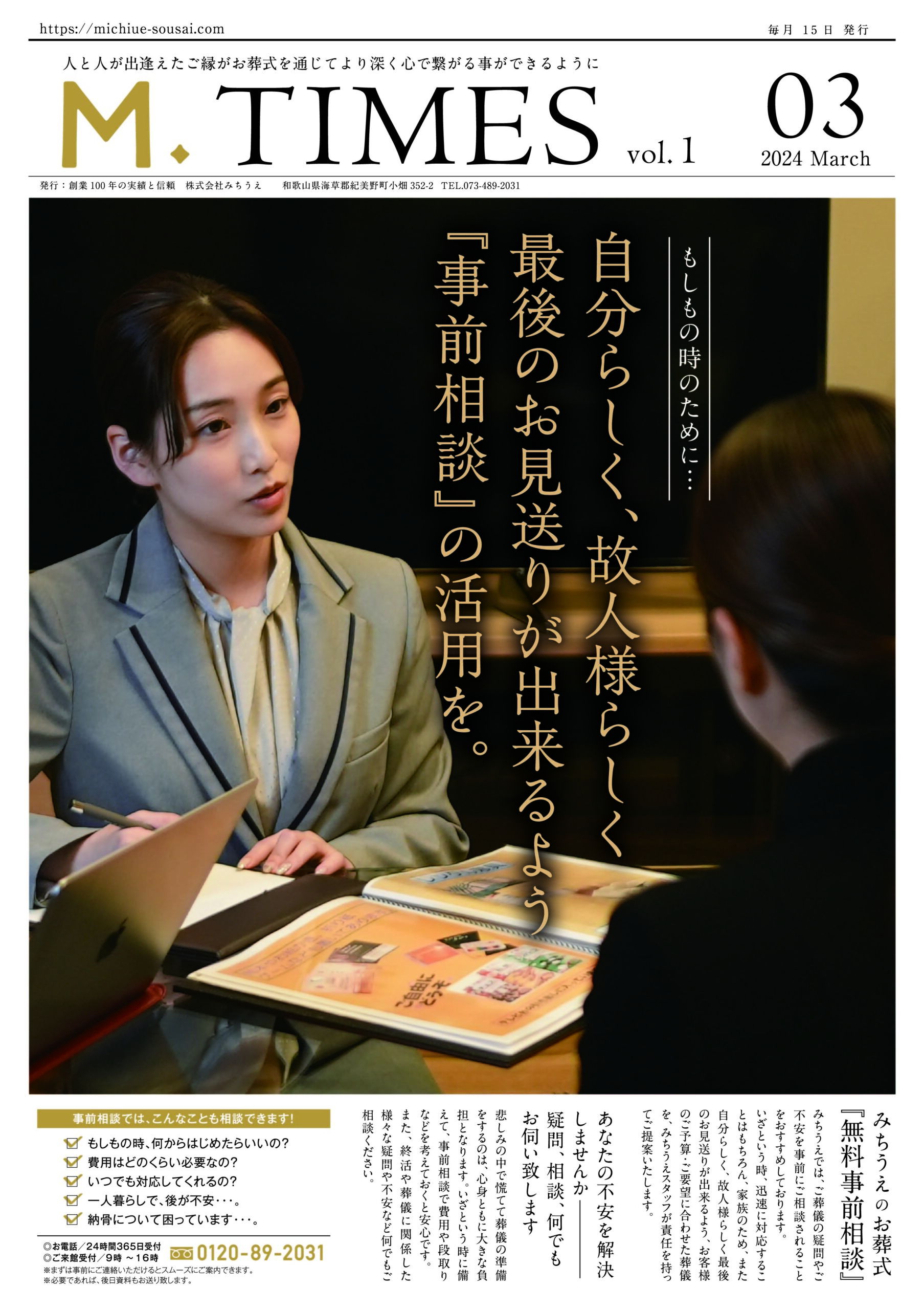 みちうえでは毎月15日に新聞の折込チラシに、お葬式の持つ本質の意味や、命の大切さ、また大切な人とのお別れの時間が後悔のない時間であって欲しいとの願いから、定期的...