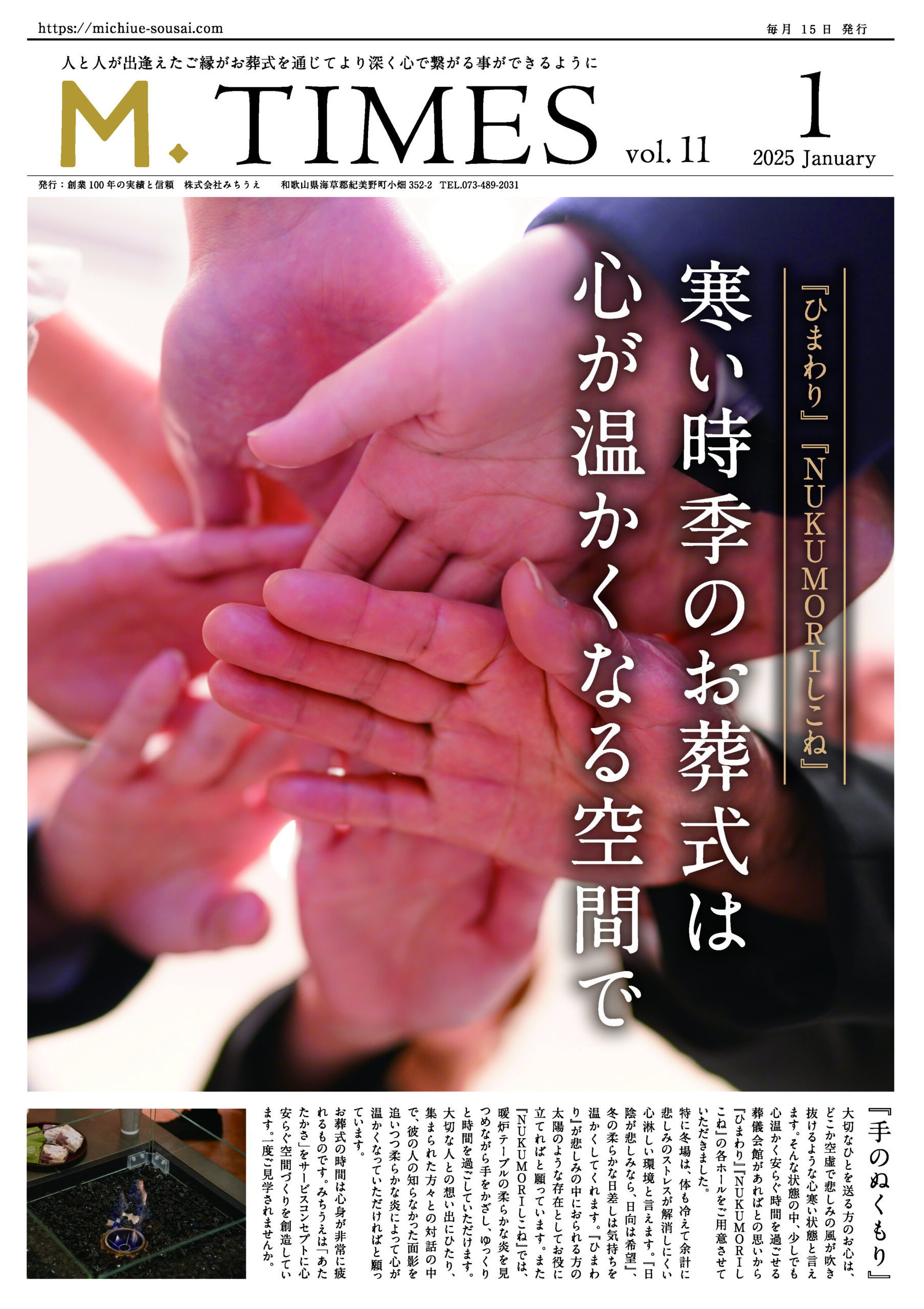 いつもM-TIMESをお読み頂き、ありがとうございます。感謝します。 M-TIMES 11号本日(1月15日)新聞折り込みされました。 今回は、寒い時季は心が温...